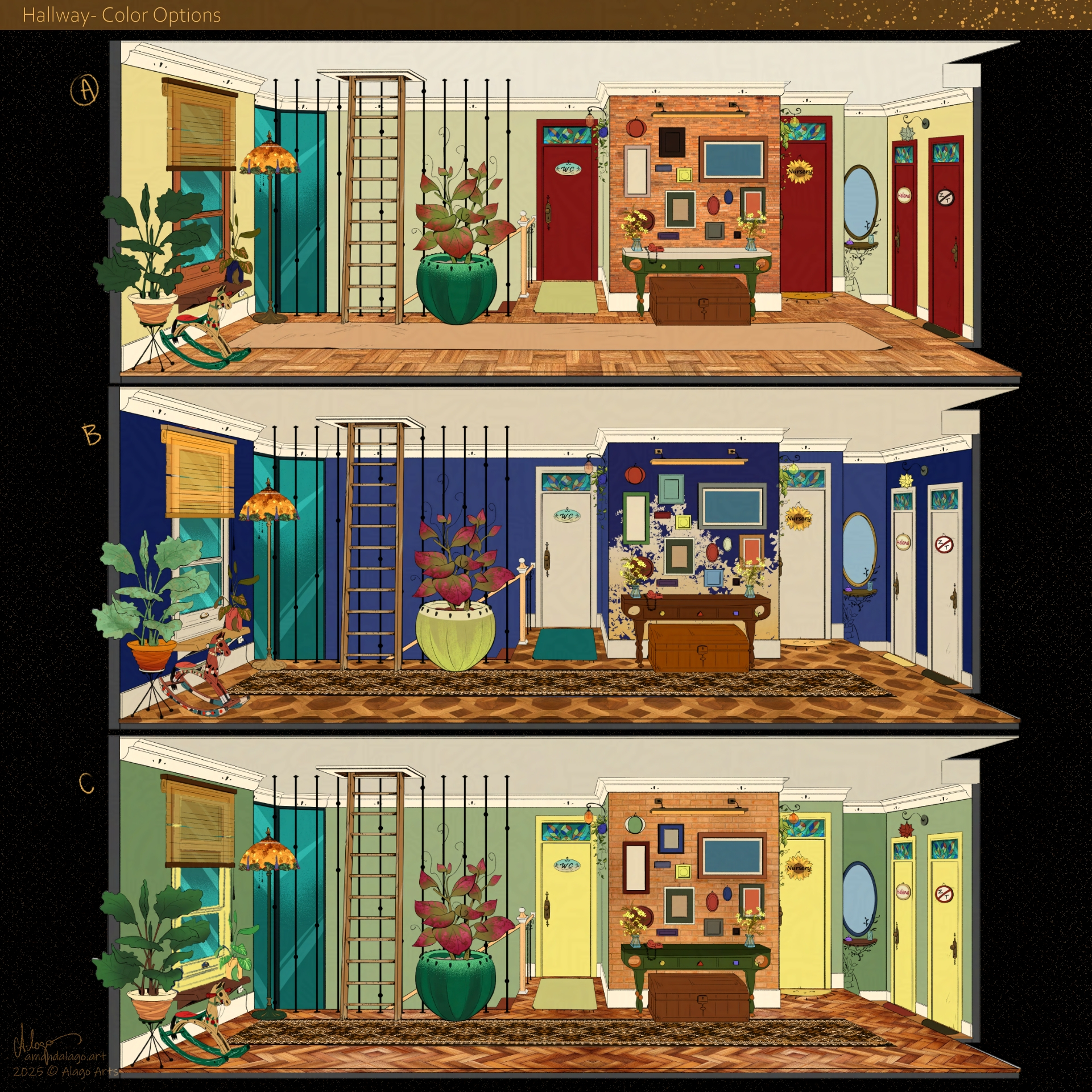 Also, here we find the attic’s stairs (which is the next room design), the common bathroom for all of the kids (imagine the cha-os), and the bedrooms’ doors.